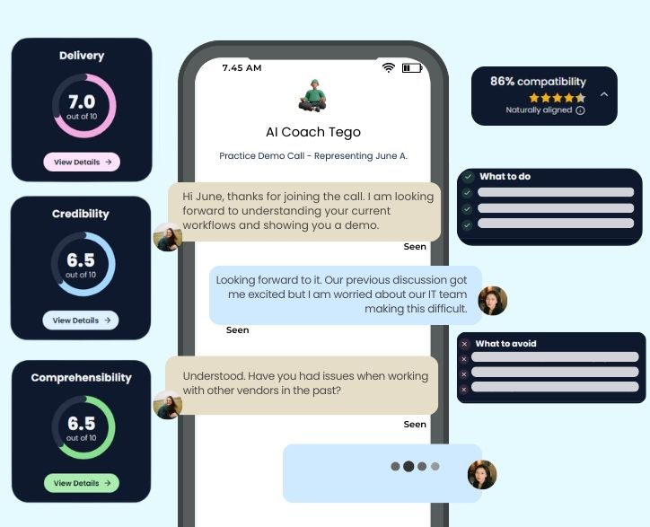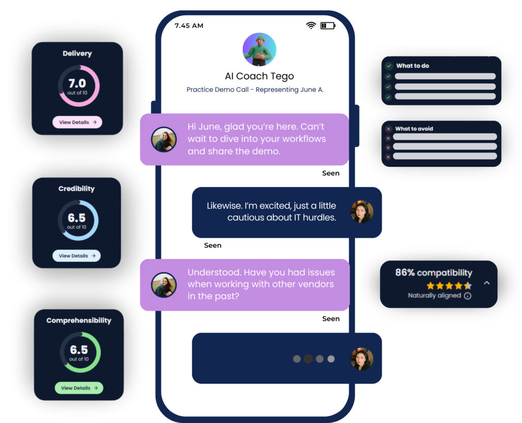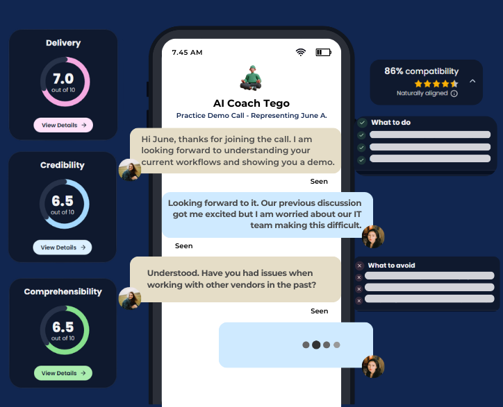Practice real scenarios, get instant feedback, and walk into conversations with confidence, powered by personalized AI coaching, that adapts to you and your buyers.